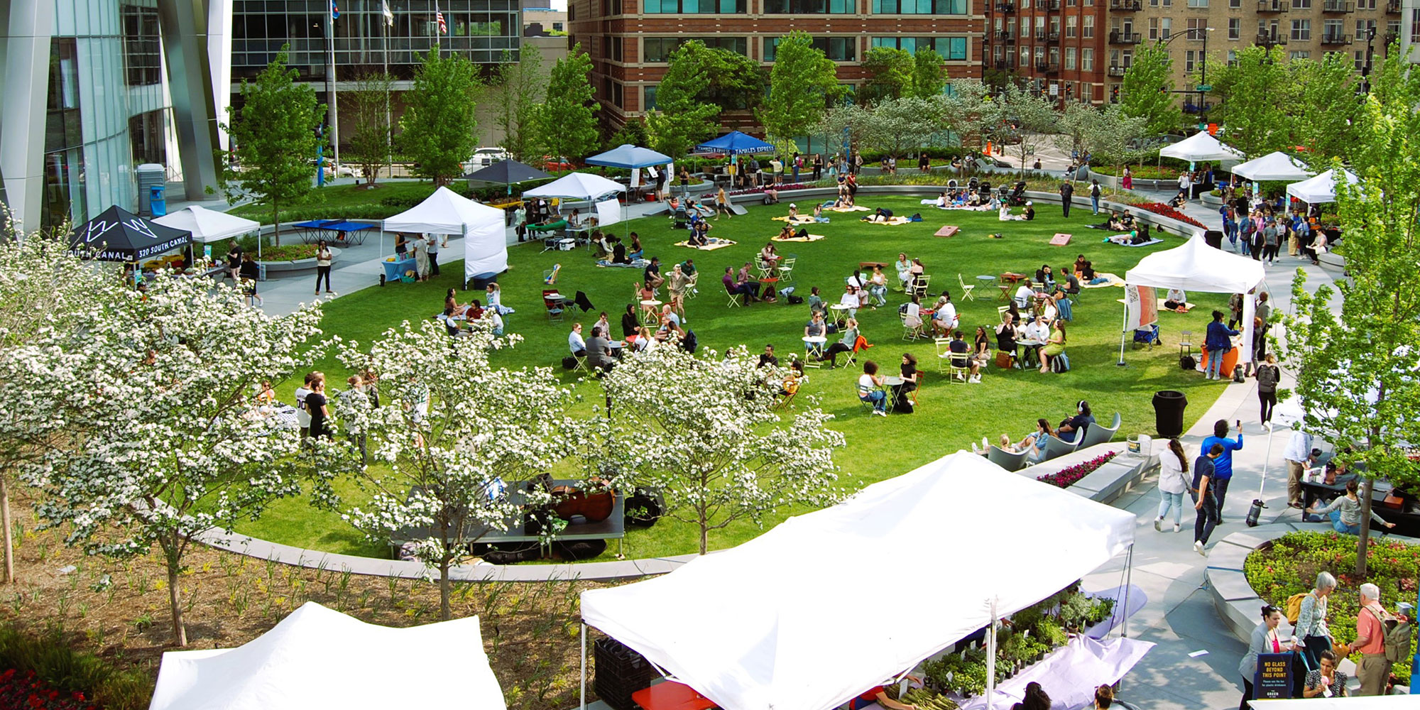 The 1.5-acre park features 10,000 SF of green space, lush landscaping, seating alcoves, and an amphitheater. Circling the oval-shaped lawn, The Green’s pedestrian paths run northeast to southwest, promoting connections between Union Station and the evolving West Loop. In addition to the Main Lawn, the park includes a variety of smaller spaces that allow for a range of events and activities, including onsite dining—all set against the backdrop of the iconic headhouse.