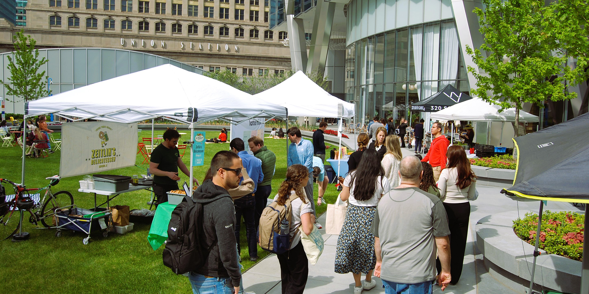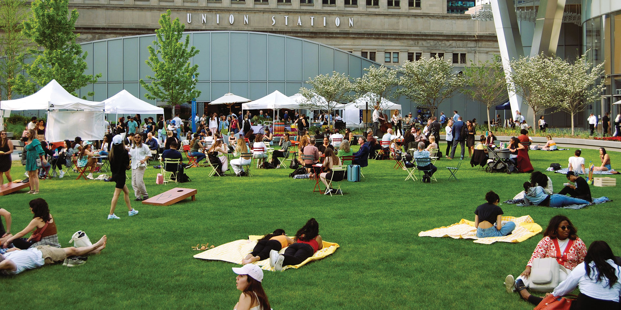 The 1.5-acre park features 10,000 SF of green space, lush landscaping, seating alcoves, and an amphitheater. Circling the oval-shaped lawn, The Green’s pedestrian paths run northeast to southwest, promoting connections between Union Station and the evolving West Loop. In addition to the Main Lawn, the park includes a variety of smaller spaces that allow for a range of events and activities, including onsite dining—all set against the backdrop of the iconic headhouse.