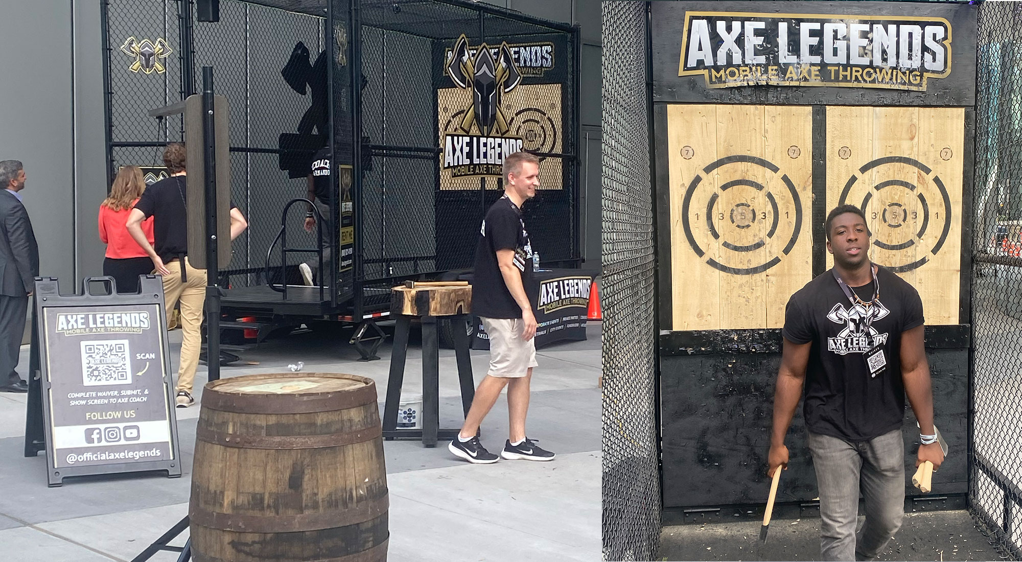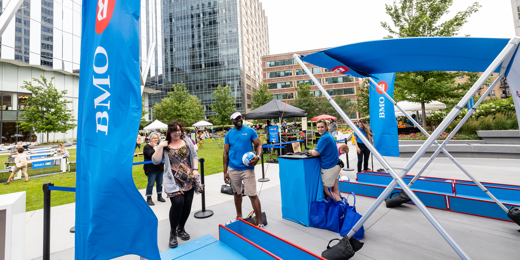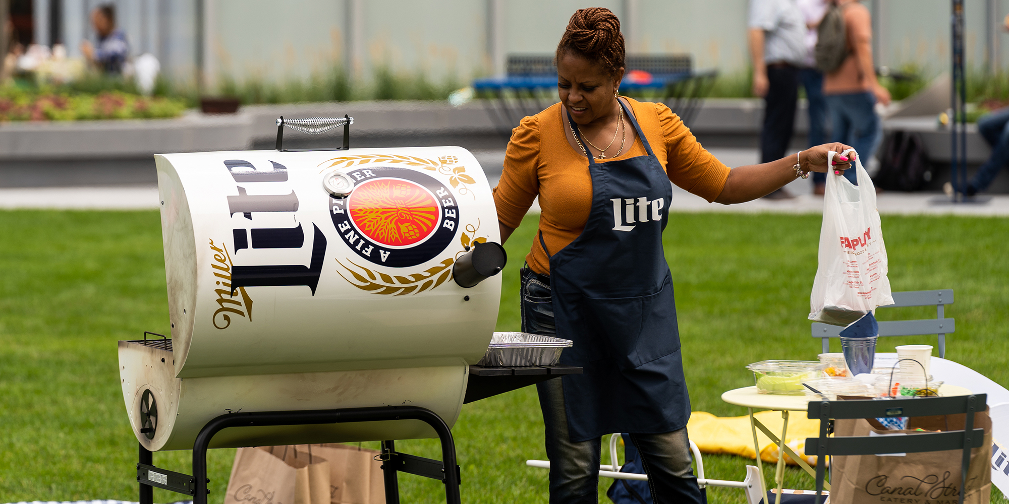 Food vendors work an event under a branded tent